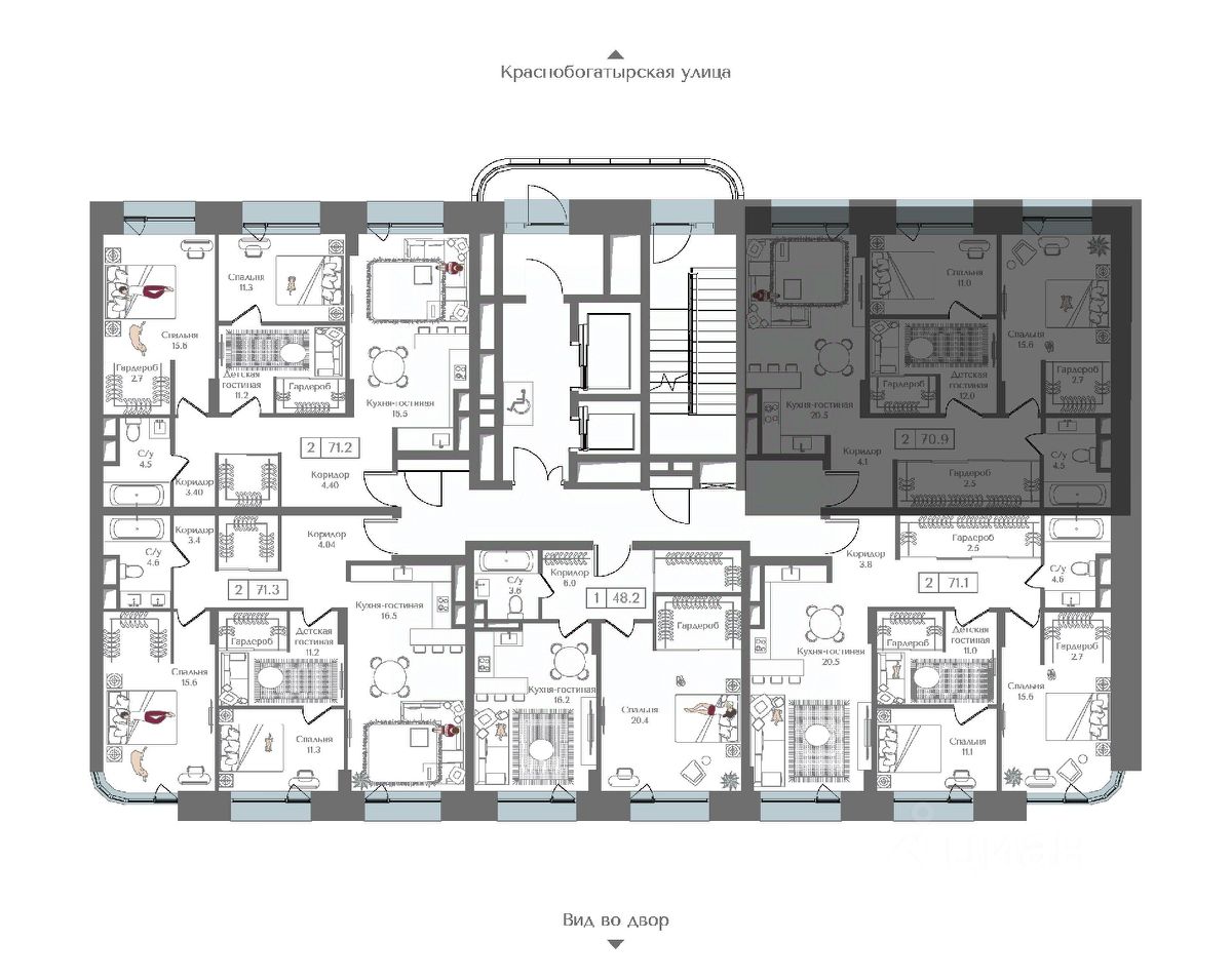 Внутренний двор 1,5 га функциональное и безопасное пространство для игр, работы и занятий спортом. Пешеходный променад для прогулок. Дома переменной этажности. Есть подземный паркинг.