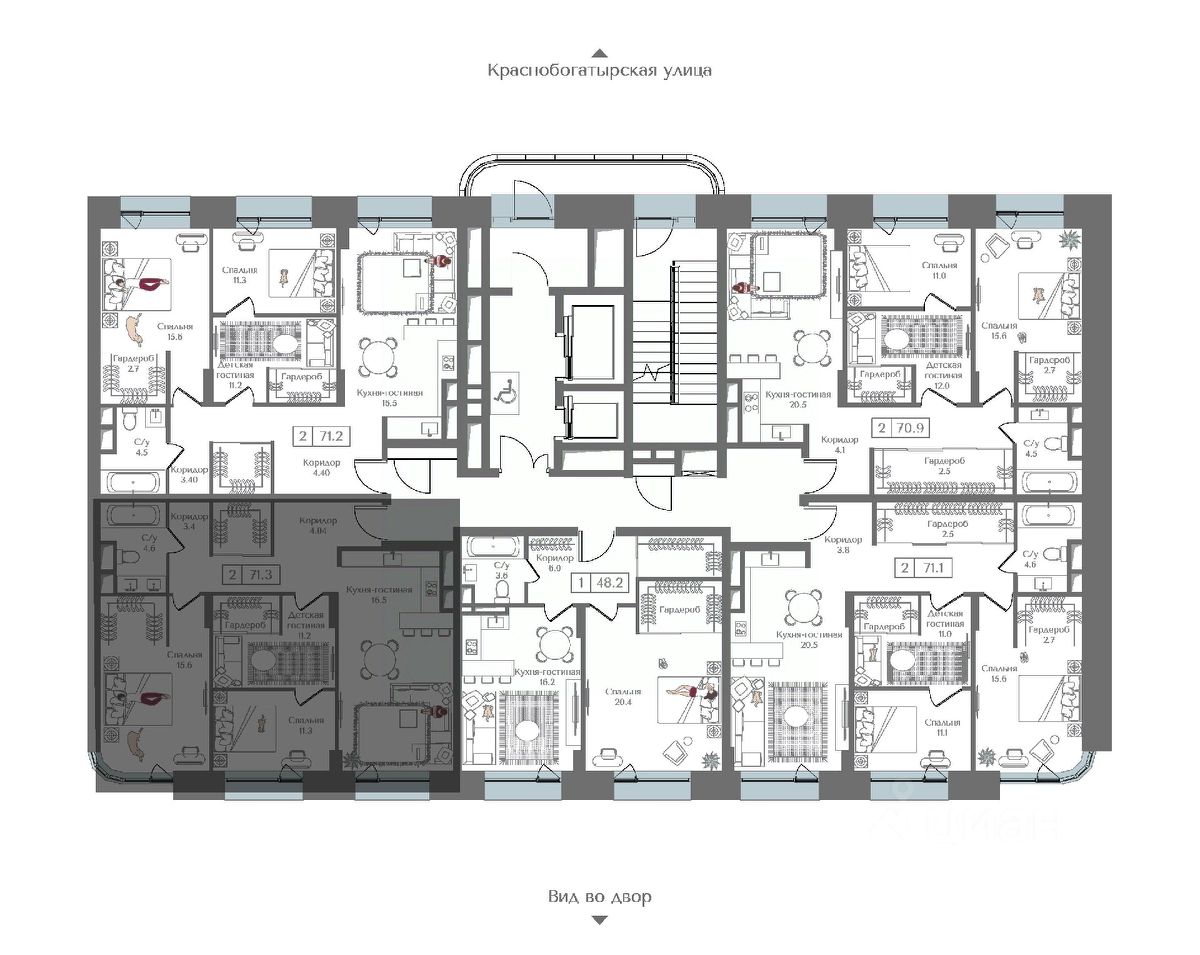 Внутренний двор 1,5 га функциональное и безопасное пространство для игр, работы и занятий спортом. Пешеходный променад для прогулок. Дома переменной этажности. Есть подземный паркинг.
