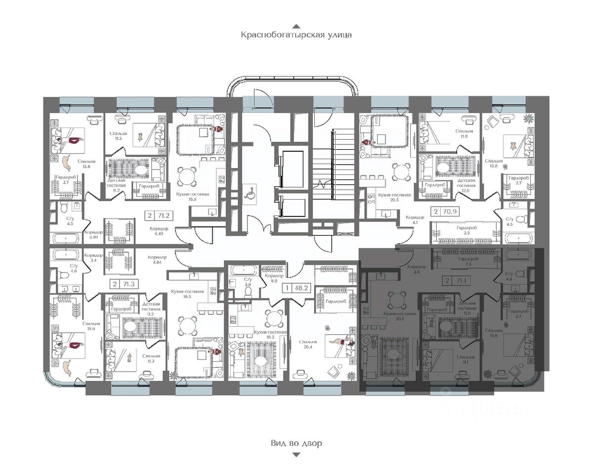 Внутренний двор 1,5 га функциональное и безопасное пространство для игр, работы и занятий спортом. Пешеходный променад для прогулок. Дома переменной этажности. Есть подземный паркинг.