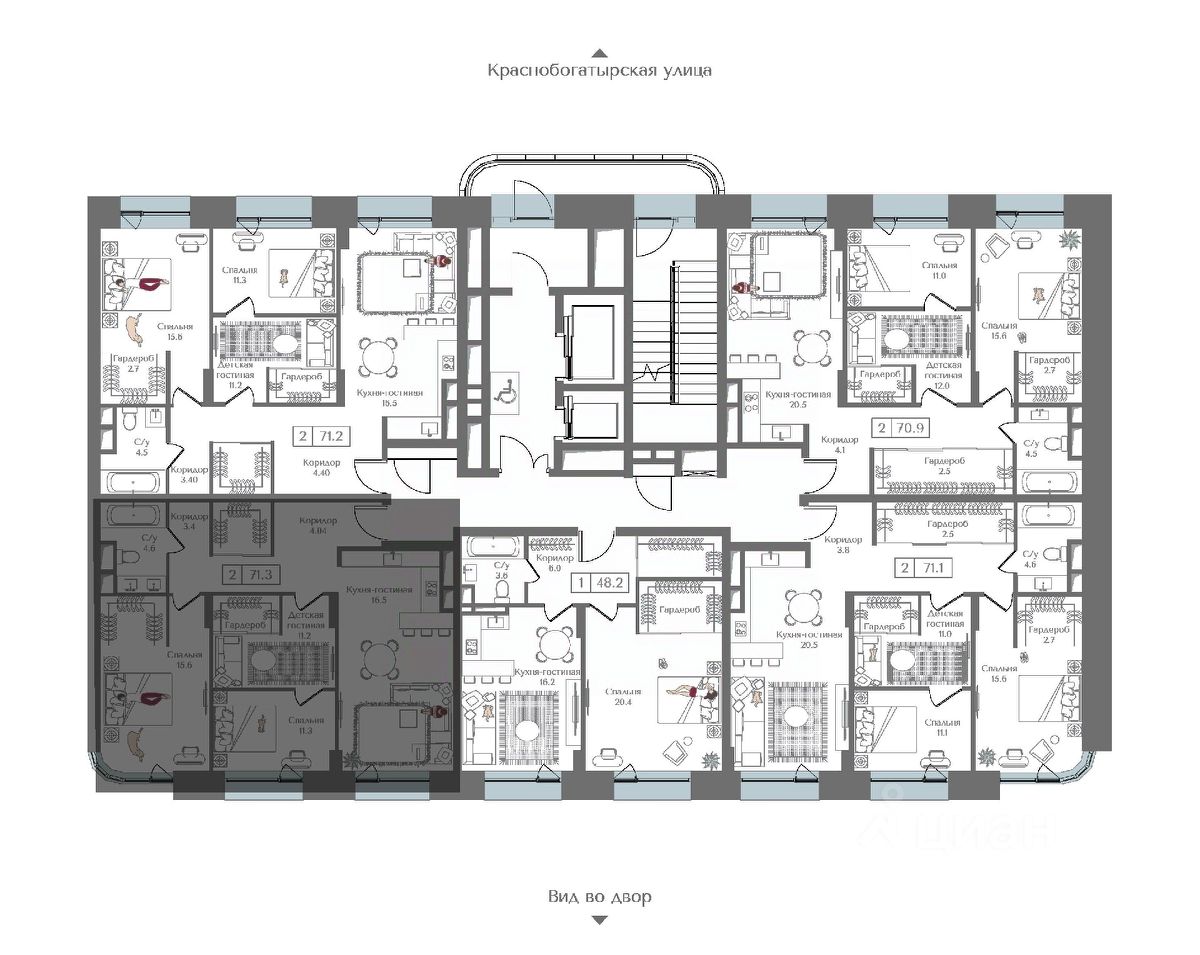 Квартира на 15 этаже в жилом комплексе премиум-класса "Преображенская площадь". Общая площадь: 71.3 кв.м.