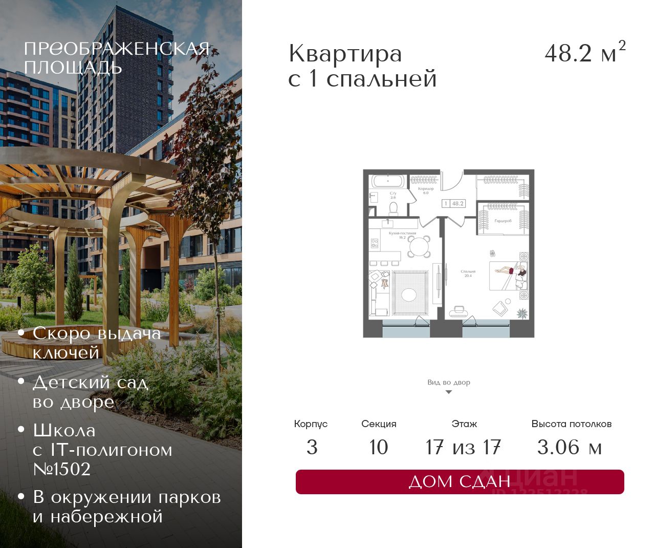 Квартира на 17 этаже в жилом комплексе премиум-класса "Преображенская площадь". Общая площадь: 48.2 кв.м.