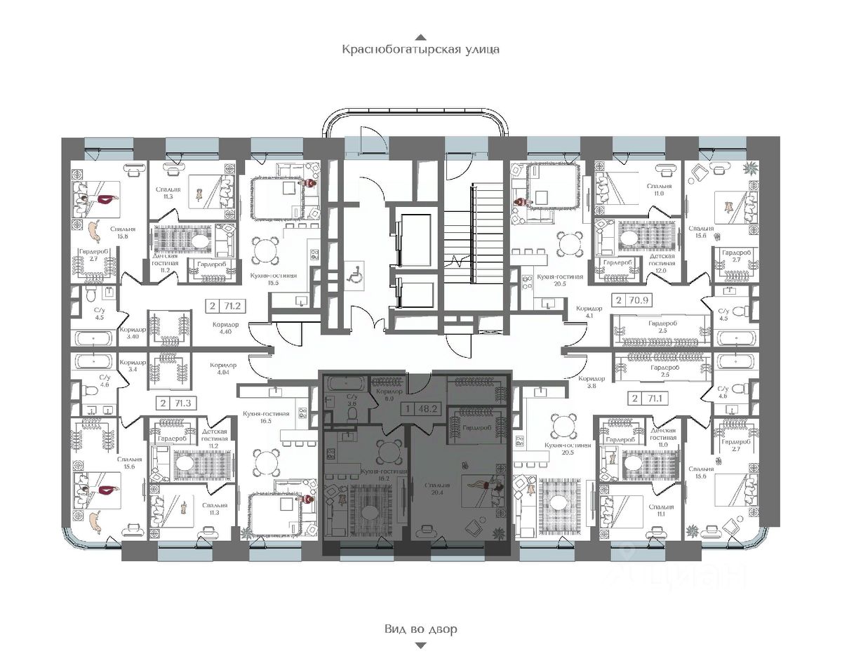 Внутренний двор 1,5 га функциональное и безопасное пространство для игр, работы и занятий спортом. Пешеходный променад для прогулок. Дома переменной этажности. Есть подземный паркинг.
