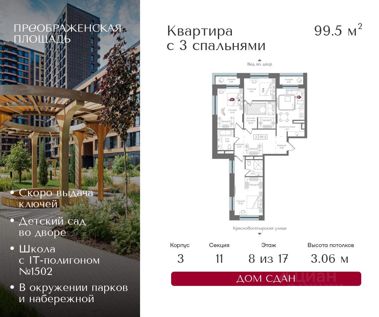 Квартира на 8 этаже в жилом комплексе премиум-класса "Преображенская площадь". Общая площадь: 99.5 кв.м.