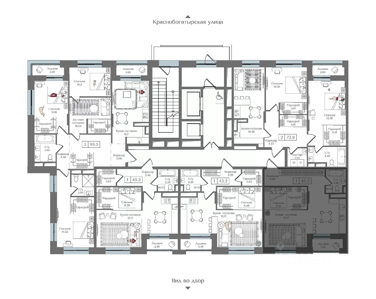 Квартира на 10 этаже в жилом комплексе премиум-класса "Преображенская площадь". Общая площадь: 45.3 кв.м.