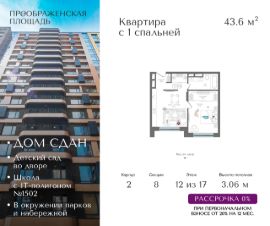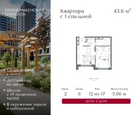 Квартира на 12 этаже в жилом комплексе премиум-класса "Преображенская площадь". Общая площадь: 43.6 кв.м.