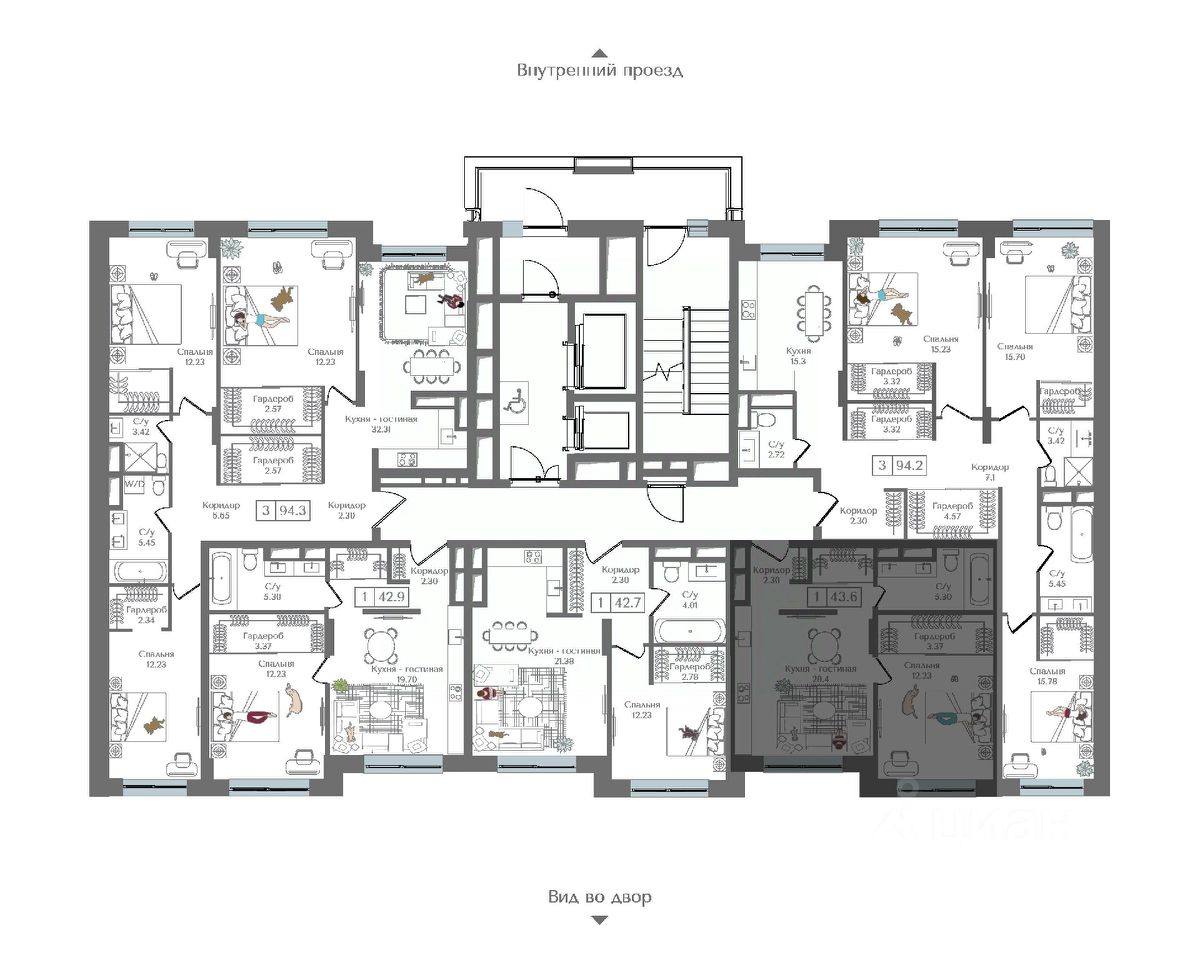 Внутренний двор 1,5 га функциональное и безопасное пространство для игр, работы и занятий спортом. Пешеходный променад для прогулок. Дома переменной этажности. Есть подземный паркинг.
