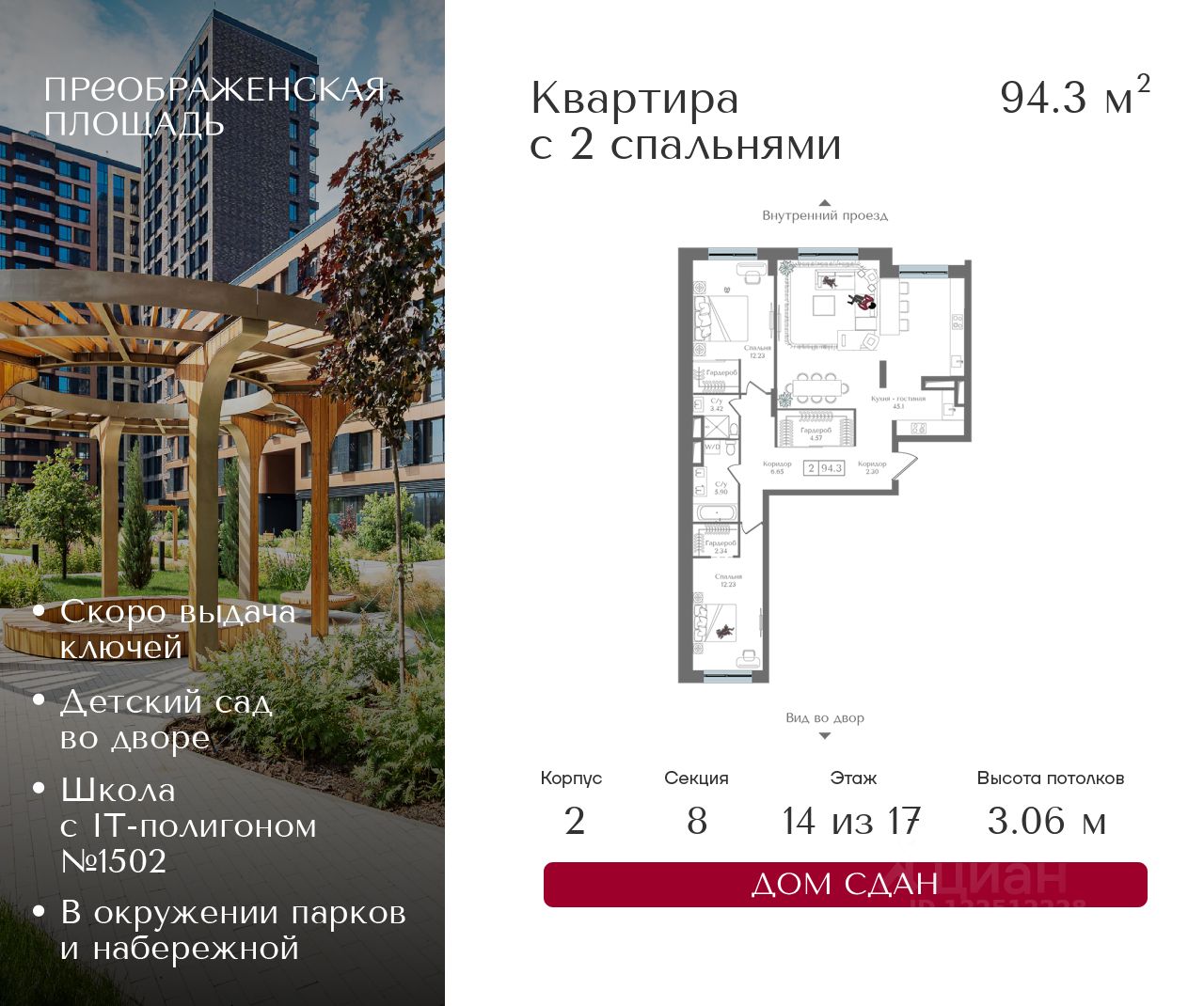 Квартира на 14 этаже в жилом комплексе премиум-класса "Преображенская площадь". Общая площадь: 94.3 кв.м.