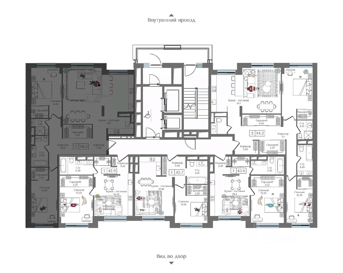 Внутренний двор 1,5 га функциональное и безопасное пространство для игр, работы и занятий спортом. Пешеходный променад для прогулок. Дома переменной этажности. Есть подземный паркинг.