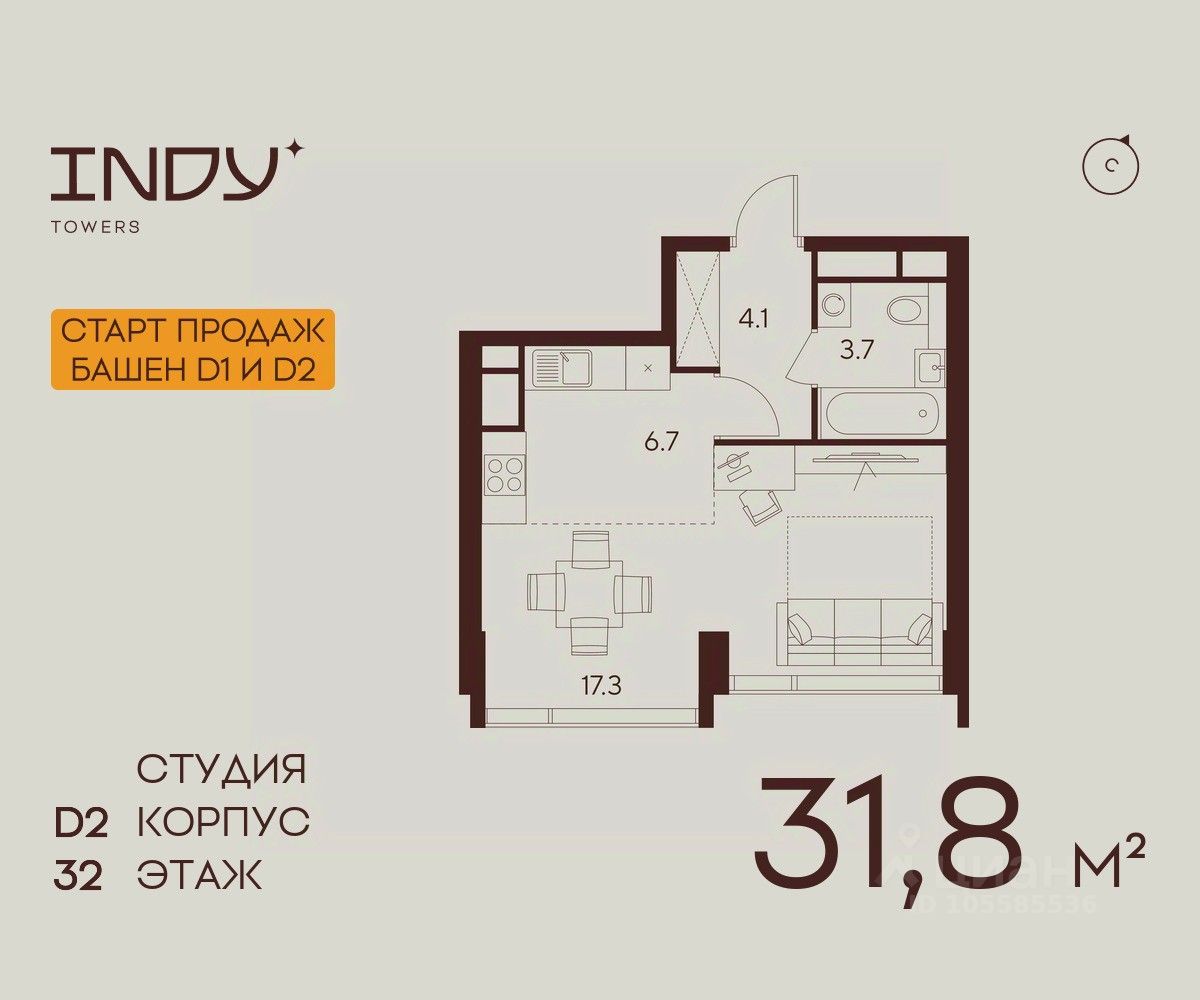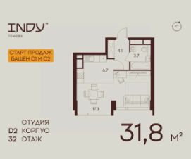 Продается просторная студия на 32 этаже жилого комплекса Indy Towers. Срок сдачи: 3 кв. 2029 г.