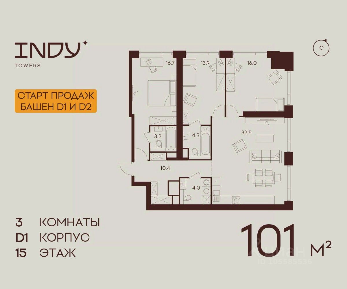 Продается просторная 3-комнатная квартира на 15 этаже жилого комплекса Indy Towers. Срок сдачи: 3 кв. 2029 г.