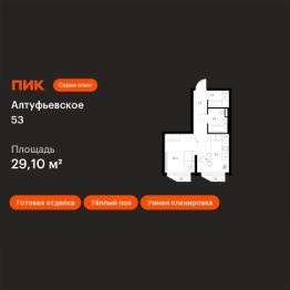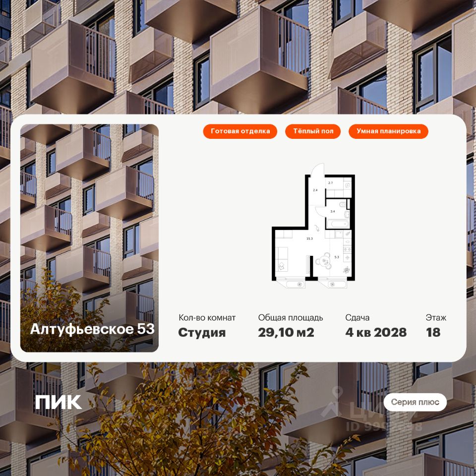 Продаётся квартира-студия площадью 29,1 кв.м на 18 этаже 32 этажного дома (Корпус 1.1, Секция 2) проекта ПИК Алтуфьевское 53. Светлый просторный подъезд на уровне земли, функциональная планировка, большие окна, c отделкой.
