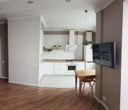 Просторная кухня-гостиная 27кв, с совмещённым балконом, станет любимым местом для семейного отдыха. В квартире две изолированные спальни (13+9кв), один совмещенный санузел, большая гардеробная/комната для хранения, второй застекленный балкон. Квартира оборудована качественной кухней и хорошей техникой. Мебель выполнена по индивидуальному заказу. В ванной установлена тумба под раковину из массива дуба.