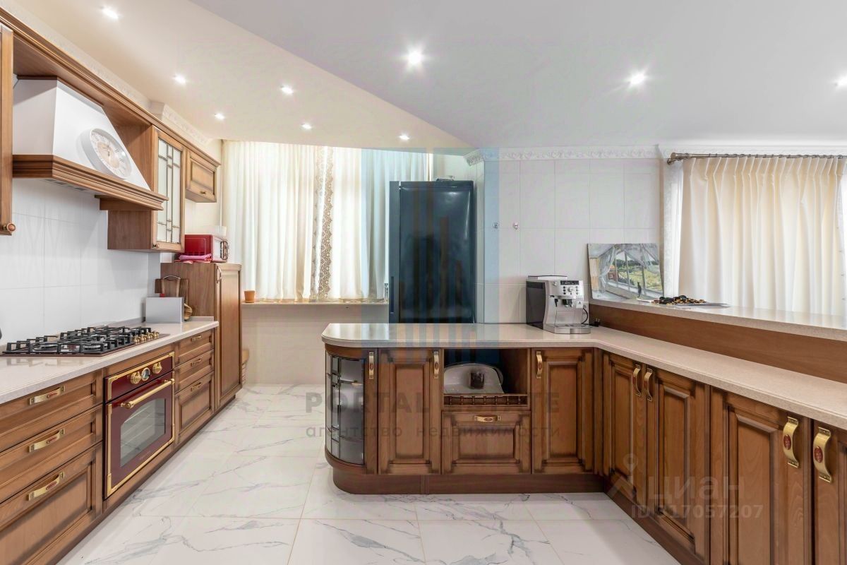Гостиную отделяет от кухни барная стойка из натурального камня. Кухонный гарнитур -массив.