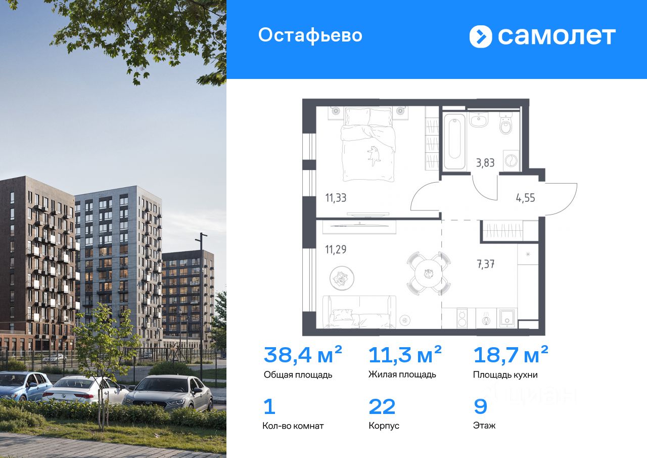 Предлагается 1-комнатная квартира комфорт-класса 38,37 кв.м в корпусе 22 на 9 этаже, в ЖК "Остафьево"