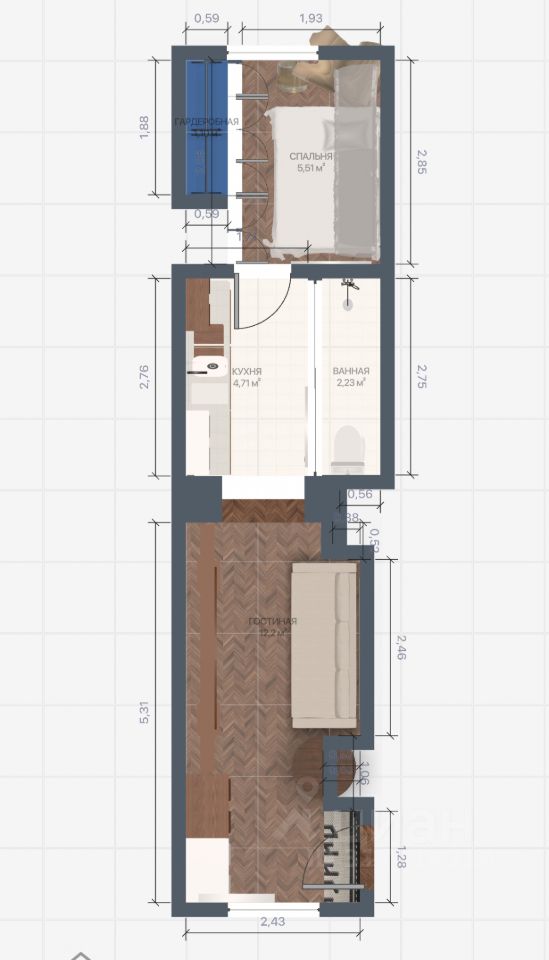 Комнаты квартиры смежные, проходные, что позволяет максимально использовать ее площадь, тк отсутствует длинные извилистые коридоры, которые нельзя использовать по назначению. Благодаря чему, квартира кажется больше.