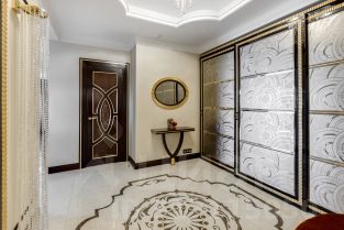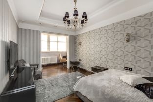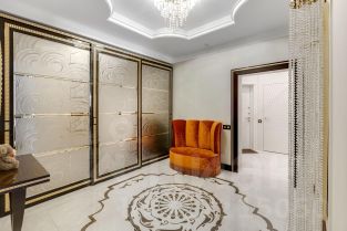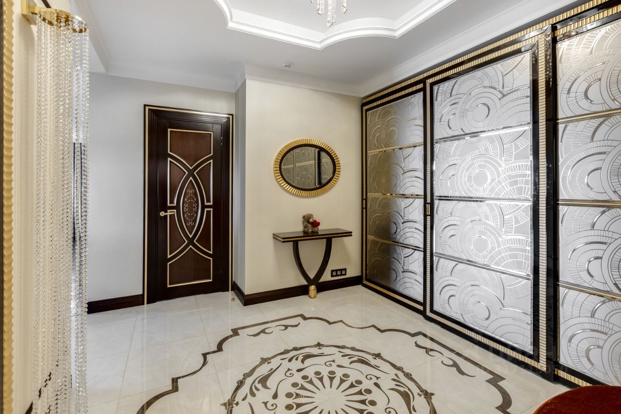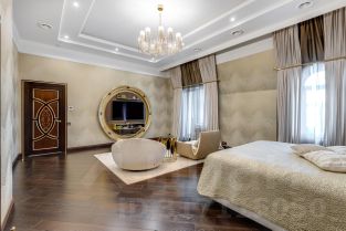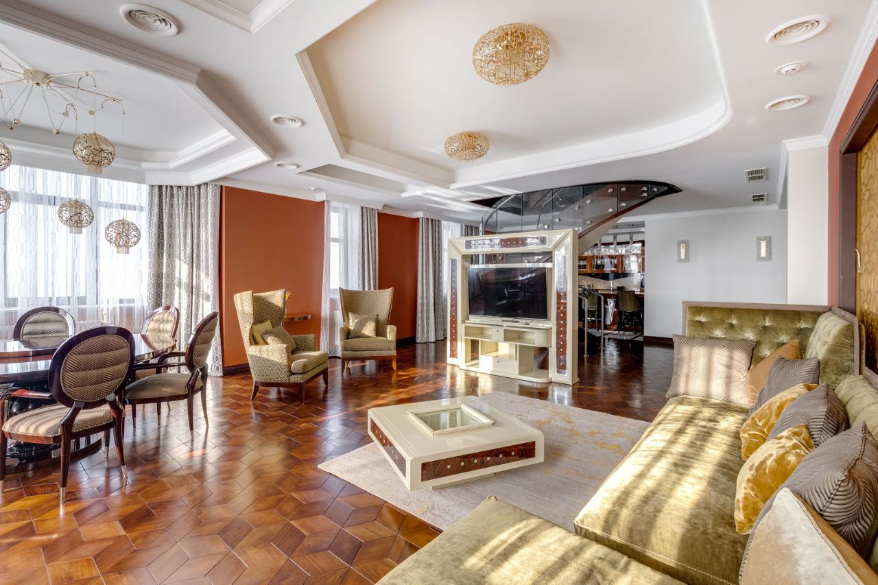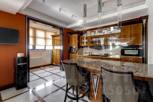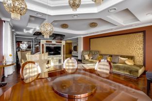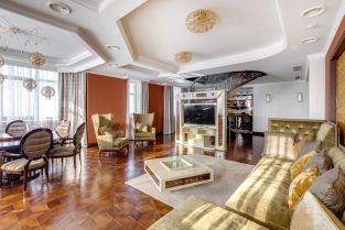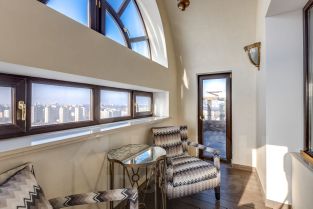 В известном жилом комплексе на западе столицы предлагается шикарный двухуровневый пентхаус на последнем этаже. Уникальная квартира со вторым светом и потолками 6м. Интерьер выполнен в стиле неоклассики, выдержан до мельчайших деталей. В отделке использованы дорогостоящие материалы - модульный паркет из ореха, паркетная доска, двери-массив, глянцевый керамогранит в молочном цвете, настенные керамические мозаики в туалетных комнатах, настенные шелковые панно - в гостиной. Вся каркасная мебель, кухонный гарнитур, уникальное многоуровневое освещение - индивидуальное итальянское исполнение.