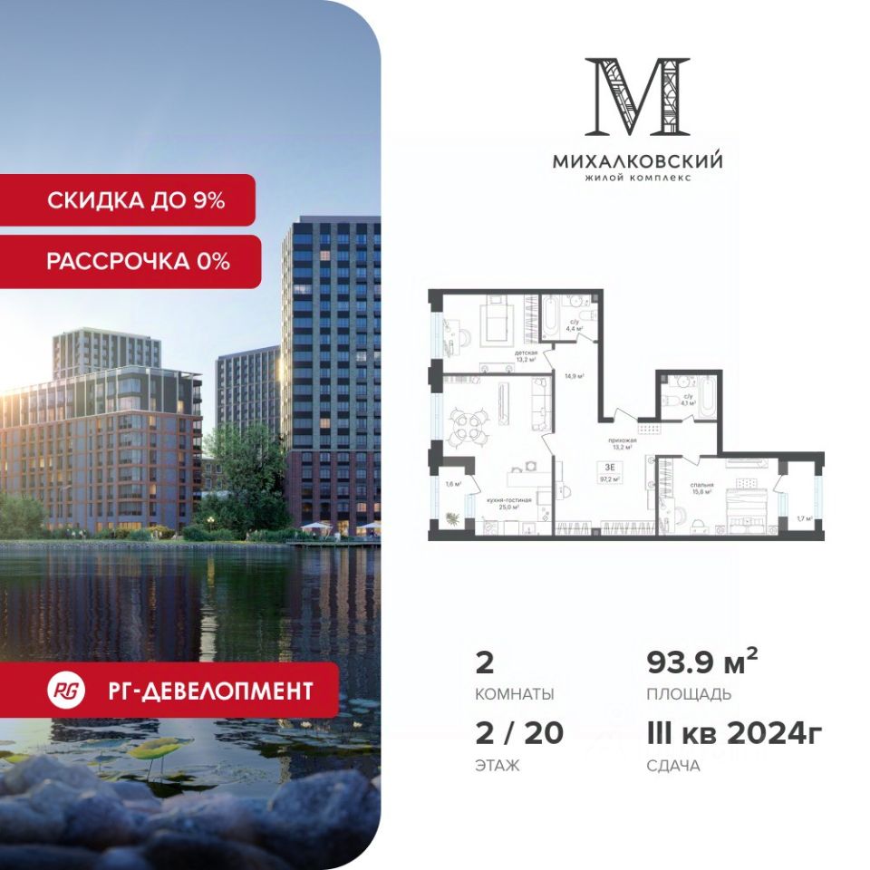 Продаётся 2-к квартира 93,9 кв.м. в ЖК "Михалковский" на 2-м этаже 20 этажного дома.