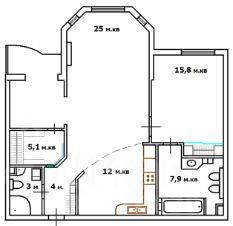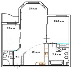 Две комнаты (25 и 12) и кухня 12 кв.м. в настоящий момент не разделены перегородками и, по сути, представляют собой единое пространство 49 кв.м., к которому примыкает третья изолированная комната (16 кв.м.) с санузлом (7,9 кв.м.).