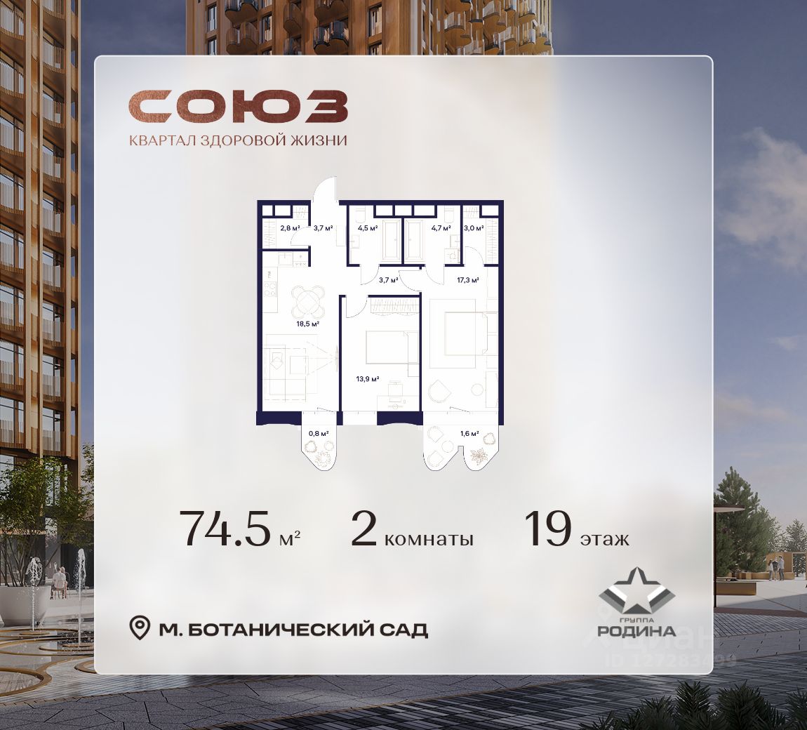 Продаётся 2-комнатная квартира площадью 74.5 м² на 19 этаже в Жилом Комплексе "Союз".