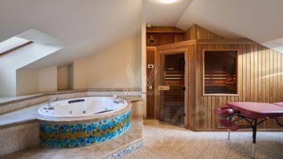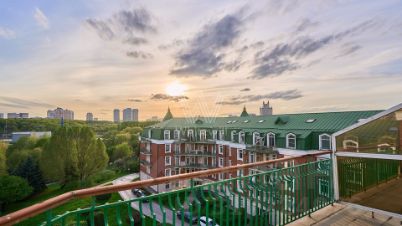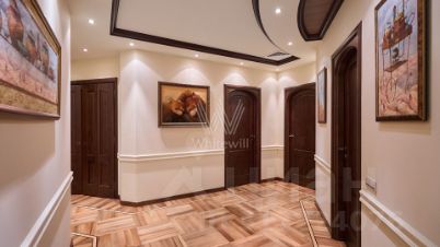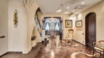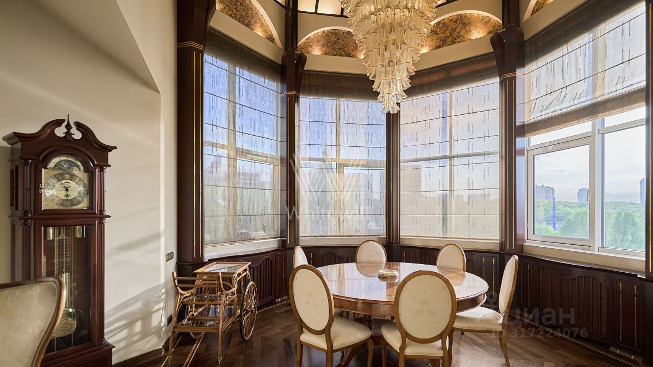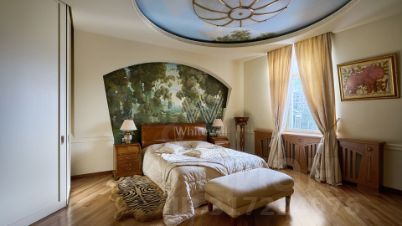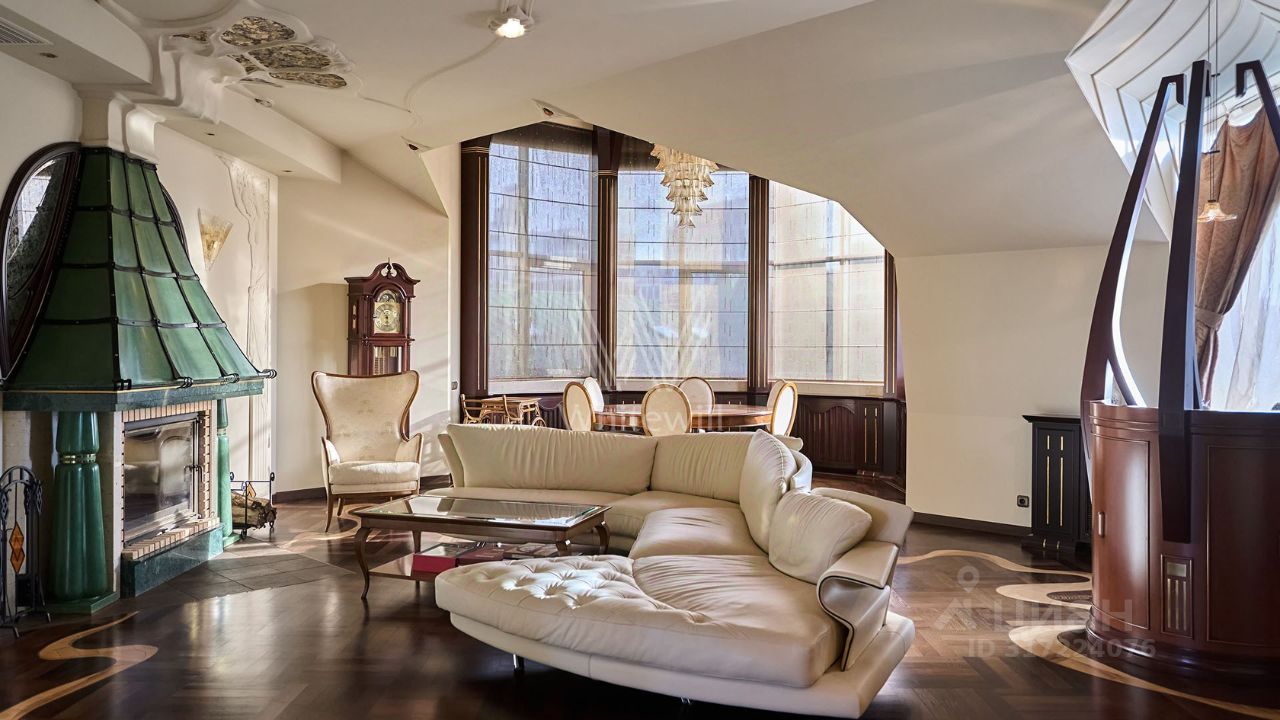 Видовая двухуровневая квартира в комплексе премиум-класса "Золотые Ключи-1" в районе Раменки. Просторная квартира площадью 398 м² расположена на последнем 6-м этаже. Выполнена дизайнерская отделка в стиле итальянского модерна. Большое количество окон, много естественного света. Установлено два действующих дровяных камина. В гостиной спланирован эркер с шестиметровым потолком и люстрой из венецианского стекла, фонтан.
