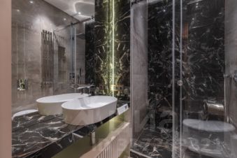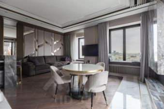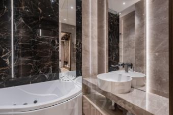 Интерьер в индивидуальном дизайн-проекте воплощен с использованием благородных, натуральных материалов: подоконники и стена камина из мрамора , инженерная дубовая доска на полу, стены - в шпоне дерева, акценты из натуральной латуни во всей отделке. Широкоформатная плитка на полу. В санузлах - коллекционная плитка Valentino и сантехника Grohe. Система умного дома - на слаботочной базе, эксклюзивная для проекта этого комплекса: управление как с мониторов, так и через смартфон.