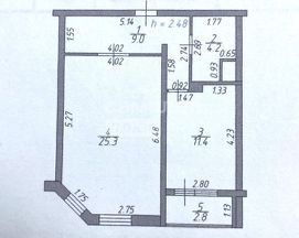 Спальня -11 м2 и кухня-гостиная в 25,3 м2, планировка приложена в фото.