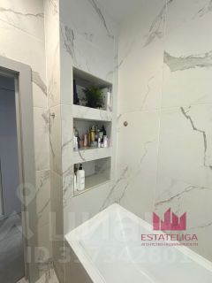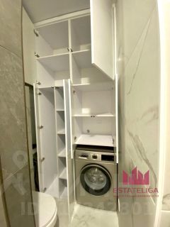 - В квартире есть совмещенный санузел с ванной , там также имеется большое количество мест хранения - встраиваемый шкаф и скрытые полочки в ванной .