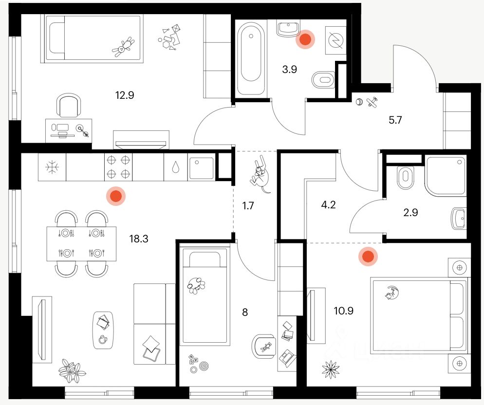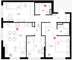 - 3 раздельные комнаты;