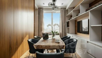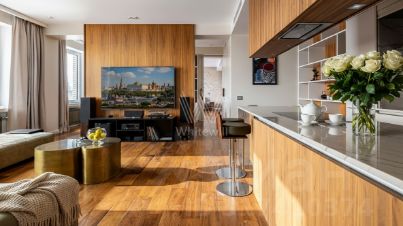 Выполнена отделка с использованием натуральных материалов — на полу массив ореха, в санузлах гранит и мрамор. Особый акцент в оформлении создается за счет панелей из дерева и графики на стенах.