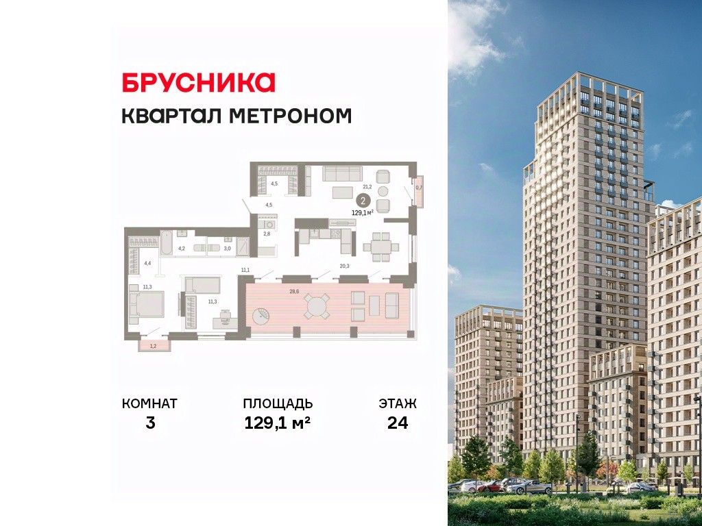 Квартира с кухней-гостиной и тремя спальнями в квартале "Метроном". Особенности планировки: балкон, без отделки, второй санузел, мастер-спальня, окна в пол, окно в коридоре, разнесённые спальни, терраса на крыше, французский балкон.