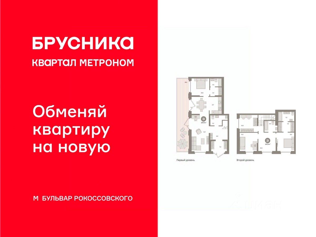 Двухуровневая квартира с кухней-гостиной и тремя спальнями в квартале "Метроном". Особенности планировки: без отделки, вид во двор, второй санузел, гардеробная, двухуровневая, мастер-спальня, окна в пол, окно в коридоре, отдельный вход, панорамное остекление, разнесённые спальни, терраса, терраса на крыше.