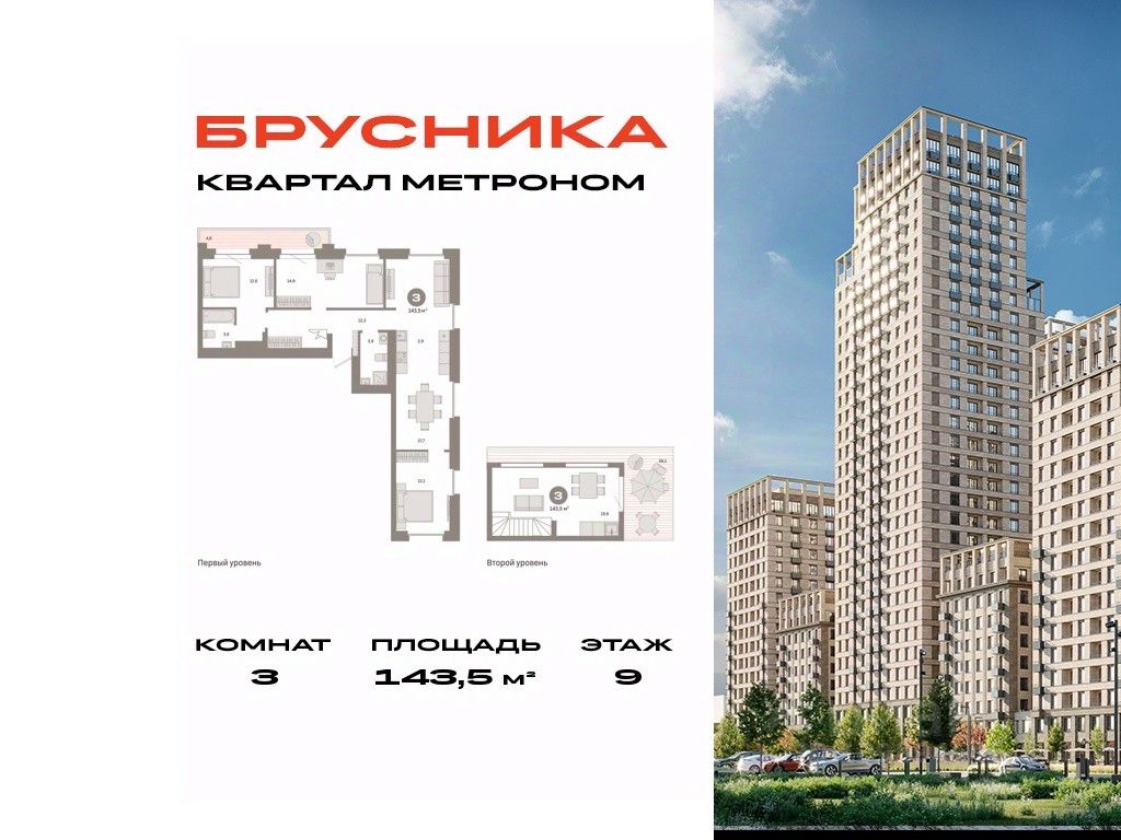 Двухуровневая квартира с кухней-гостиной и тремя спальнями в квартале "Метроном". Особенности планировки: ипотека 8%, окно в коридоре, без отделки, двухуровневая, вид во двор, панорамное остекление, мастер-спальня, терраса, балкон, терраса на крыше.