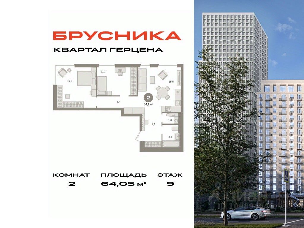 Квартира с кухней-гостиной и двумя спальнями в квартале Герцена. Особенности планировки: окна на две стороны, предчистовая отделка, постирочная.