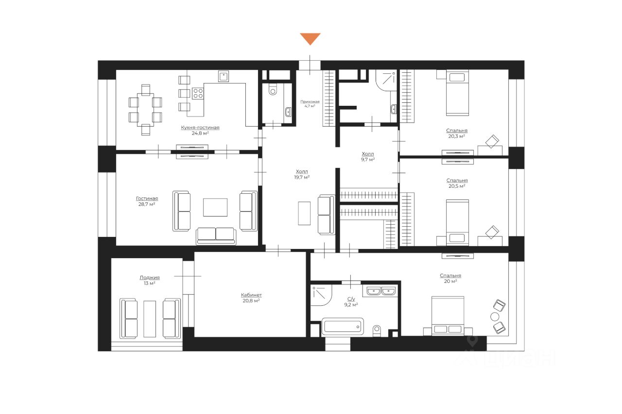 ФУНКЦИОНАЛЬНОЕ ПЛАНИРОВОЧНОЕ РЕШЕНИЕ: просторная кухня-столовая с лоджией, гостиная, мастер-спальня с собственной ванной и гардеробной комнатами, три спальни, ванная комната, гостевой с/у, гардеробные, постирочная.