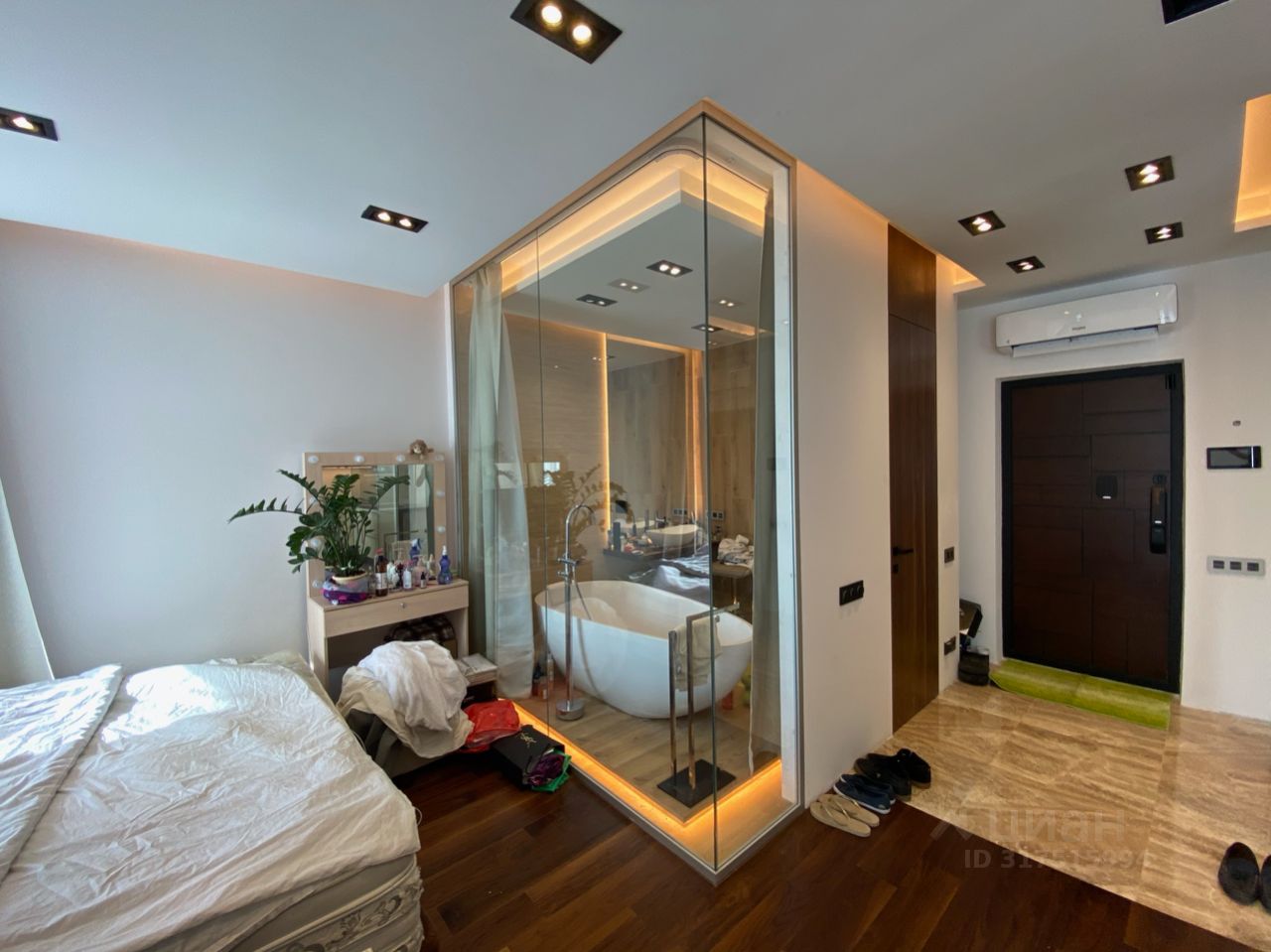 • Панорамный стеклянный бокс ванной с электрошторой: одним нажатием — открыто/закрыто.