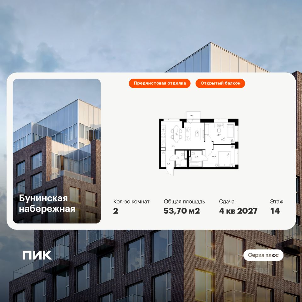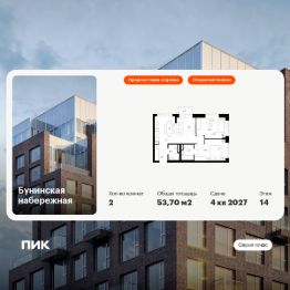 Продаётся 2-комн. квартира площадью 53,7 кв.м на 14 этаже 16 этажного дома (Корпус 2.6/1.2, Секция 2) проекта ПИК Бунинская набережная. Светлый просторный подъезд на уровне земли, функциональная планировка, большие окна, предчистовая отделка.