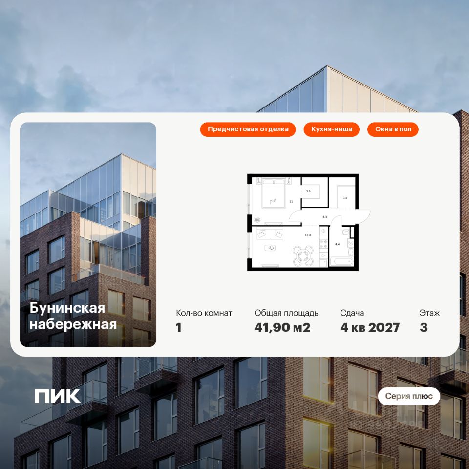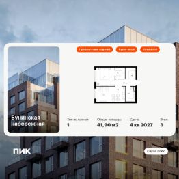Продаётся 1-комн. квартира площадью 41,9 кв.м на 3 этаже 16 этажного дома (Корпус 2.6/1.2, Секция 2) проекта ПИК Бунинская набережная. Светлый просторный подъезд на уровне земли, функциональная планировка, большие окна, предчистовая отделка.