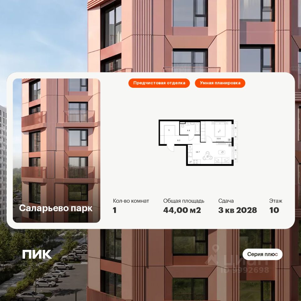 Продаётся 1-комн. квартира площадью 44 кв.м на 10 этаже 23 этажного дома (Корпус 69.1, Секция 1) проекта ПИК Саларьево парк. Светлый просторный подъезд на уровне земли, функциональная планировка, большие окна, предчистовая отделка.
