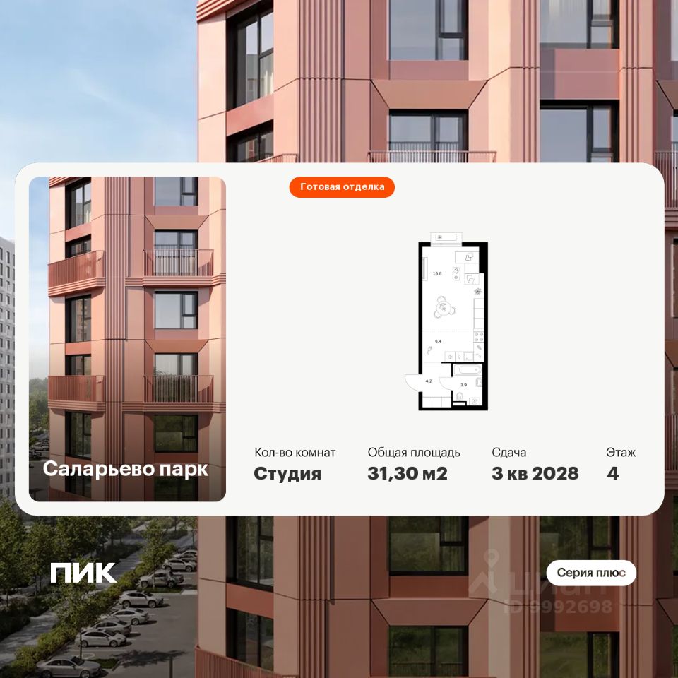 Продаётся квартира-студия площадью 31,3 кв.м на 4 этаже 14 этажного дома (Корпус 69.6, Секция 6) проекта ПИК Саларьево парк. Светлый просторный подъезд на уровне земли, функциональная планировка, большие окна, c отделкой.