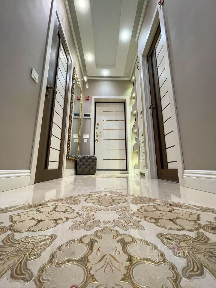 Эта квартира воплощение роскоши и стиля! Уникальный дизайнерский проект придаст вашему дому неповторимый шарм. Начиная с просторной прихожей с теплым полом из испанской плитки из сусального золота и большим зеркалом в золотистом багете вы почувствуете себя настоящей звездой! Стены покрыты специальной моющей американской краской Benjamin Moore, что обеспечит легкость в уходе. А проходные выключатели Nessan и ниша с подсветкой добавят оригинальности вашему интерьеру.