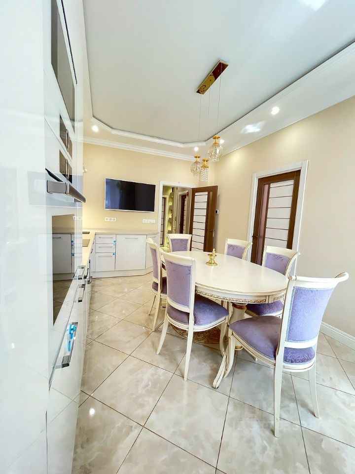 На кухне вы найдете всё необходимое для приготовления кулинарных шедевров! Эмалированные кухонные фасады с каменной столешницей и встроенной техникой Bosch обеспечат вашей семье уютные обеды и праздничные ужины. Овальный раздвижной стол из массива дерева и стулья придают классический шарм этому пространству.