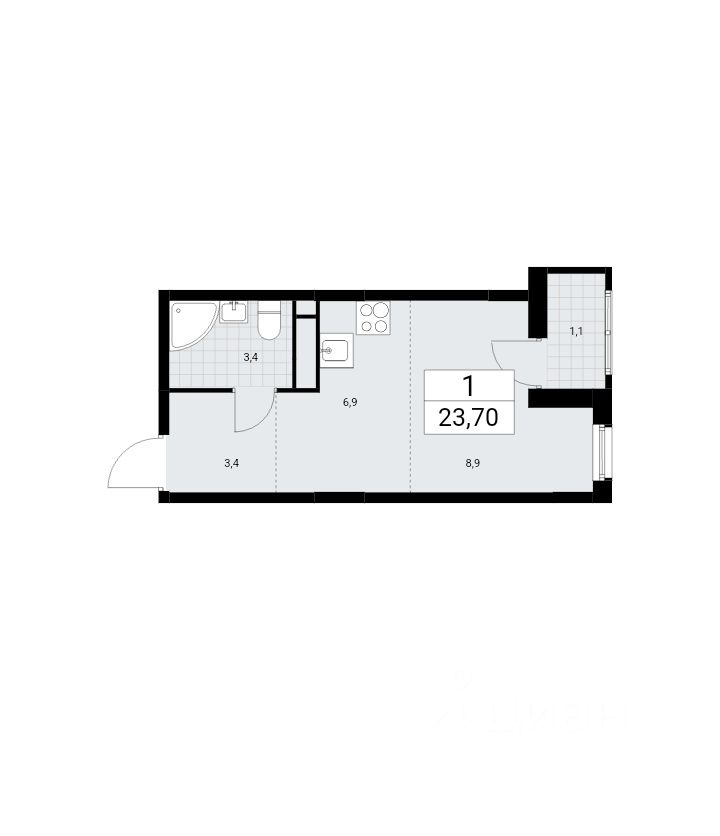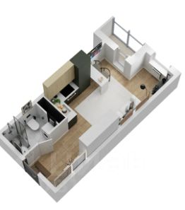 Общая площадь квартиры составляет 23,7 м². Высота потолков 2,99 м.