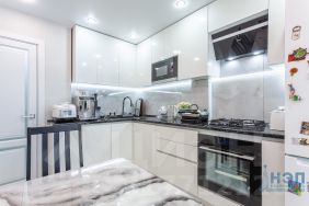 Во всей квартире, в том числе и кухне установлены мощные кондиционеры 4 штуки (вся разводка проходит в стенах), дорогой ламинат 33 класса, немецкие натяжные потолки во всей квартире со встроенными умными лампами (управление голосом через Алису) и металлическими карнизами для занавесок, в которые встроены светодиодные разноцветные ленты с пультами. На кухне зонированное освещение; рабочая зона оборудована светодиодной подсветкой (управляется также голосом), дорогая металлическая дверь. Большой тамбур на 3 квартиры с дружелюбными соседями. Лоджия на 2 окна застеклена и утеплена, балкон также утеплен. Дорогие межкомнатные двери. В квартире установлен видеодомофон, камера (с датчиком движения и записью) выведена за тамбур.