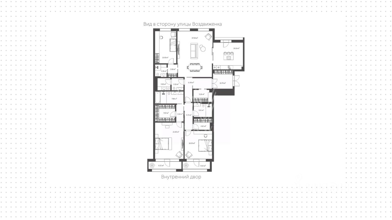 Квартира площадью 198 м² с предчистовой отделкой whitebox deluxe расположена на 3-м этаже. 3 спальни с собственными гардеробными и ванными, гостевой санузел с постирочной зоной, гардеробная, 2 балкона, прихожая. Окна ориентированы на две стороны, открывая панорамные виды в сторону улицы Воздвиженка и на красивый благоустроенный двор-сад.