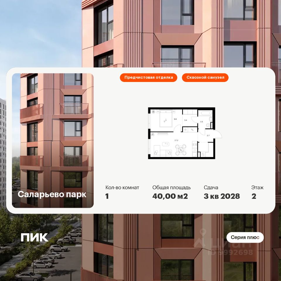 Продаётся 1-комн. квартира площадью 40 кв.м на 2 этаже 23 этажного дома (Корпус 69.1, Секция 1) проекта ПИК Саларьево парк. Светлый просторный подъезд на уровне земли, функциональная планировка, большие окна, предчистовая отделка.
