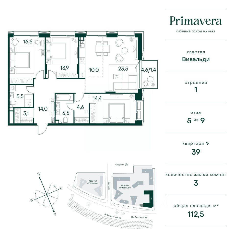 Клубный город на реке Primavera — это современный жилой комплекс премиум-класса, расположенный на первой береговой линии Москвы-реки в экологически чистом районе Покровское-Стрешнево. Под панорамными окнами квартир находится собственный экопарк с продуманной сетью прогулочных дорожек и современными детскими и спортивными площадками. За парком расположена набережная с собственным пляжем и зонами для отдыха. Клубный город на реке Primavera предлагает широкий выбор планировок для различных жизненных сценариев: от просторных однокомнатных квартир до пентхаусов и жилых помещений с террасами и патио. Выберите из 120 вариантов эргономичных планировок стандартного и евроформата. Из каждой квартиры открываются красивые виды на реку с углом обзора в 270 градусов. Дизайнерские лобби предлагают панорамный обзор на благоустроенный двор. Высокие потолки в 6 метров и качественная отделка создают атмосферу, схожую с пятизвездочными отелями. В Primavera есть всё необходимое для комфортной жизни в мегаполисе: • Образование для детей в шаговой доступности: 4 школы, 8 детских садов и развивающие центры с кружками и секциями. • Удобства на расстоянии приятной прогулки: супермаркеты, кафе, рестораны с верандами, салоны красоты, аптеки и многофункциональный центр для шоппинга и развлечений. • Умный дом: автоматизированное бесконтактное управление основными системами доступа и безопасности через мобильное приложение. Клубный город на реке Primavera выгодно сочетает комфорт городской жизни с близостью к природе. Живите в месте, где все создано для вашего удобства!