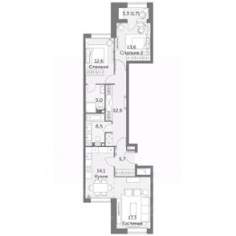 У квартиры есть ряд преимуществ: можно сделать три полноценные спальнии и оставить кухню 14 кв.м. Можно сделать кухню - гостиную - 14,1 + 17,3 кв.м., а зону личного пространства вывести в отдельную зону спален, одна из которых с санузлом.