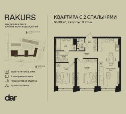 Продаётся 2-комнатная квартира 66.30 м² в жилом комплексе Ракурс. Квартиру отличают панорамное остекление, потолки 2,9 м, улучшенная шумо и воздухоизоляция. Дом сдаётся в 1 квартале 2028 года, продажи проходят через эскроусчета. Подземный паркинг, коворкинг, закрытая благоустроенная территория с фонтаном и артобъектами. Гибкие условия покупки.