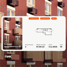 Продаётся 2-комн. квартира площадью 67,8 кв.м на 10 этаже 14 этажного дома (Корпус 3.2, Секция 5) проекта ПИК Большая Академическая 85. Светлый просторный подъезд на уровне земли, функциональная планировка, большие окна, c отделкой.