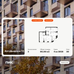 Продаётся 3-комн. квартира площадью 80 кв.м на 30 этаже 32 этажного дома (Корпус 1.1, Секция 2) проекта ПИК Алтуфьевское 53. Светлый просторный подъезд на уровне земли, функциональная планировка, большие окна, c отделкой.